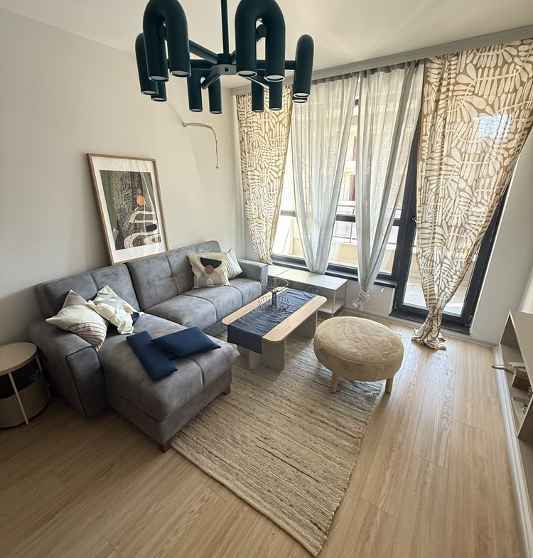Представяме ви 2-стаен апартамент обзаведен по дизайнерски проект в сграда на асфалтирана улица с входирани документи за акт16. Намира се в непосредствена близост до множество търговски обекти, спирки и предстоящата местростанция. Перфектен е както за собствено ползване, така и за отдаване под наем като ние от 'Имотен център България' предлагаме цялостно управление на имота със сигурен ежемесечен доход на пазарната цена, дори и при период без наематели. От нас може да очаквате: