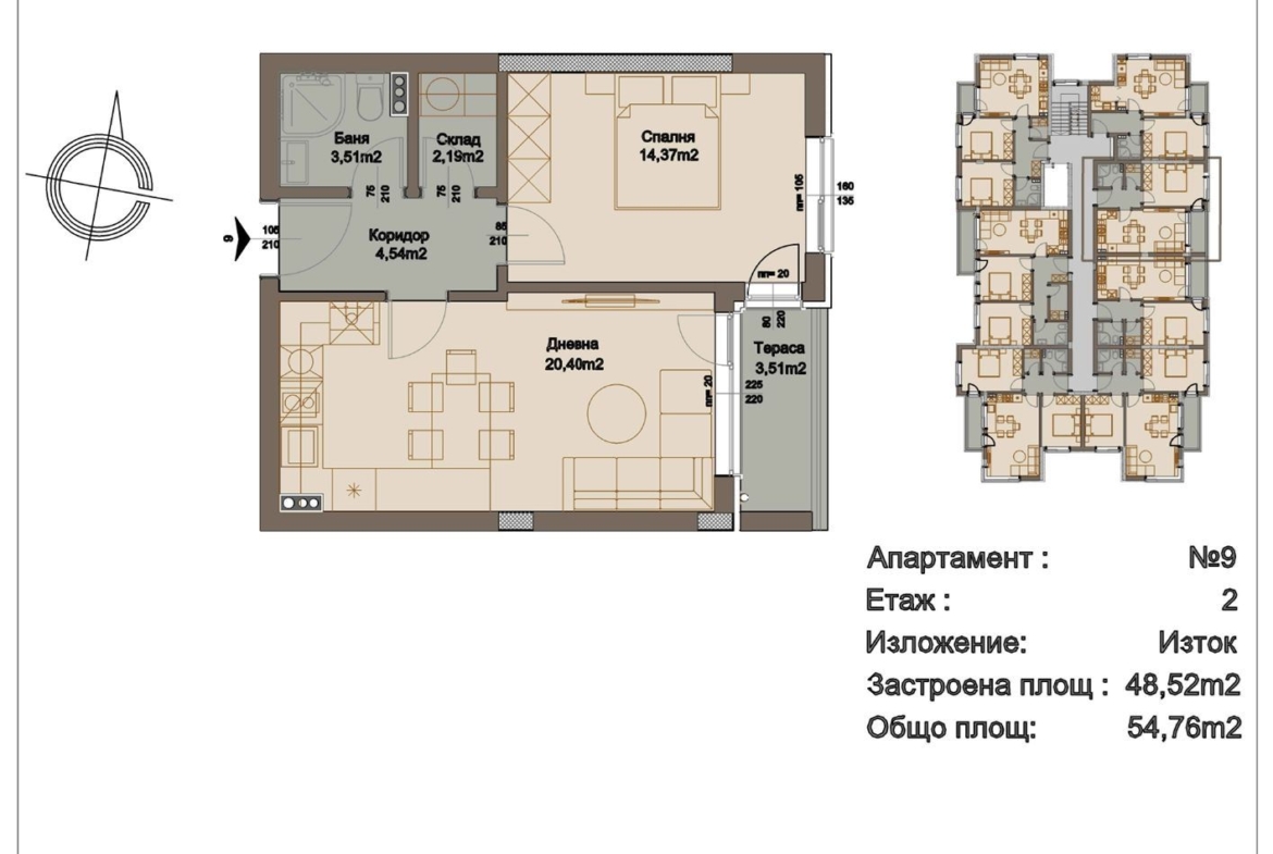 Разпределение: Всекидневна с кухненски бокс, спалня, баня с тоалетна, складово помещение, коридор и тераса.