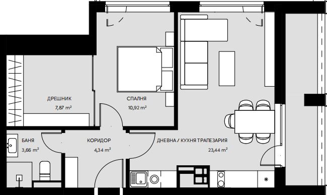 Апартаментът се състои от: антре, дневна с кухненски бокс, трапезарна част и излаз към просторна, източна тераса (8 кв.м), спалня с голям дрешник (общо двете - 19 кв.м) и санитарен възел. Локализиран е на етаж 1 (над партер). Непреходен, светъл и с функционално разпределение!