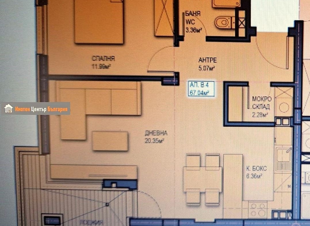 Разпределение: входно антре, дневна с кухненски бокс, спалня, баня с тоалетна, тераса и мокро помещение