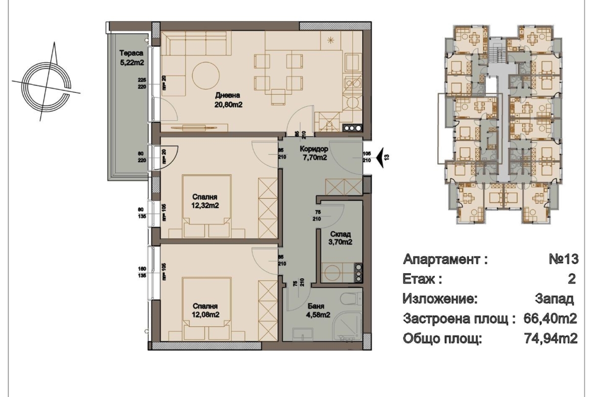 Разпределение: Всекидневна с кухненски бокс, 2 спални, баня с тоалетна, складово помещение, коридор и тераса.