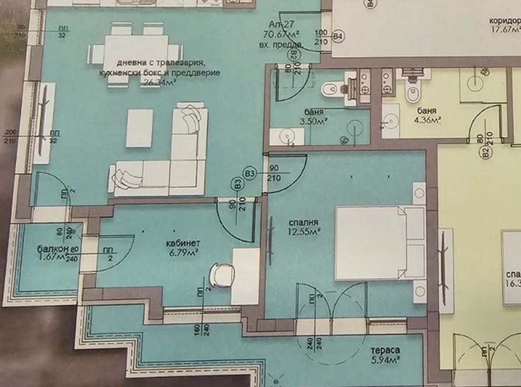 Описания апартамент е разположен на 5ти от 6ти етаж , с чиста квадратура 71кв.м.