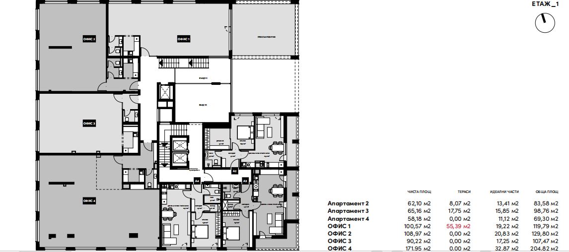 Офисът се състои от едно основно пространство (Open Space), кухня, антре и санитарен възел