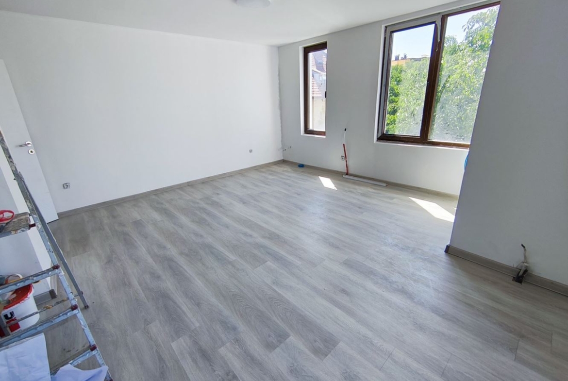 Апартаментът се предлага с готови подови настилки, боядисани стени, готова баня и интериорни врати.