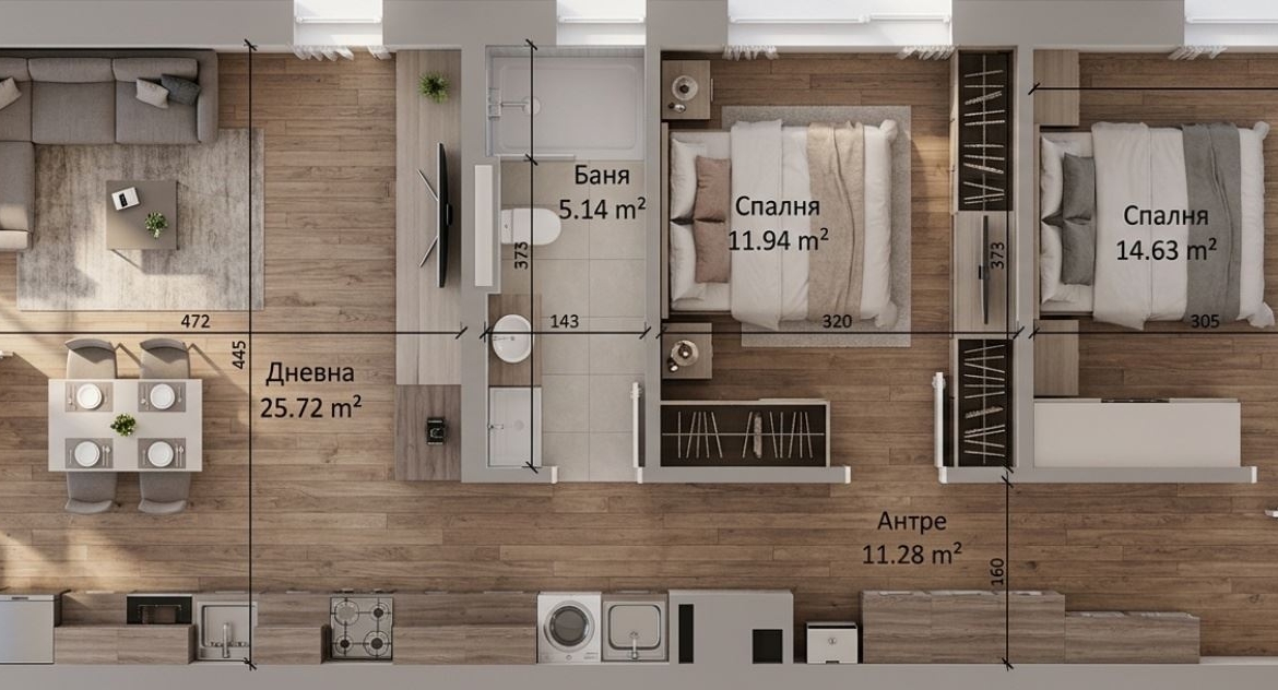- Имота се състои от: дълго антре с ниша за пералня и сушилня, дневна с кухненски бокс, две непреходни спални, баня с тоалетна и балкон